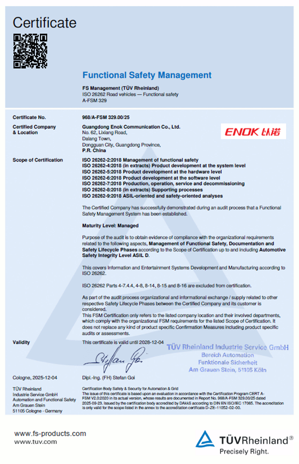 近日,國際獨立第三方檢測、檢驗和認證機構德國萊茵TüV集團(TüV Rheinland)正式向福日電子成員企業以諾通訊頒發ISO 26262:2018汽車功能安全管理體系認證證書。該認證確認,以諾通訊已按照汽車功能安全最高等級ASIL-D要求,建立了產品全生命周期的功能安全開發與管理流程體系,標志著公司在汽車電子通訊領域的功能安全能力達到國際先進水平。